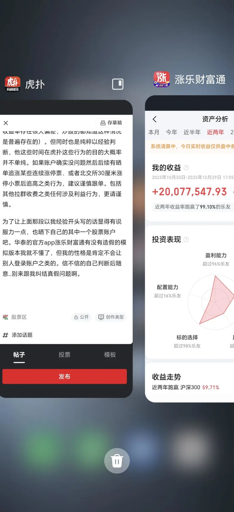 順便提醒一句吧,以我經(jīng)驗,我大致是傾向于相信他賬戶目前的信息的真實性的(指最近的曬單買賣持倉信息之類信息傾向于相信是真實的,但所謂幾年幾十倍收益,我是存疑的。我懷疑的情形是目前賬戶金額沒問題,收益率可能券商軟件也確實那樣顯示的,但因為資金存入取出的情況導(dǎo)致賬戶真實收益率和券商顯示收益率存在很大偏差,炒股的都知道這種情況是普遍存在的)。但同時也是純粹以經(jīng)驗判斷,他這些時間在虎撲這些行為的目的大概率并不單純。如果賬戶確實沒問題然后后續(xù)有曬單追漲某些連續(xù)漲停票、或者北交所30厘米漲停小票后追高之類行為,建議謹(jǐn)慎跟單。包括其他拉群收費之類任何涉及利益行為,更請謹(jǐn)慎。