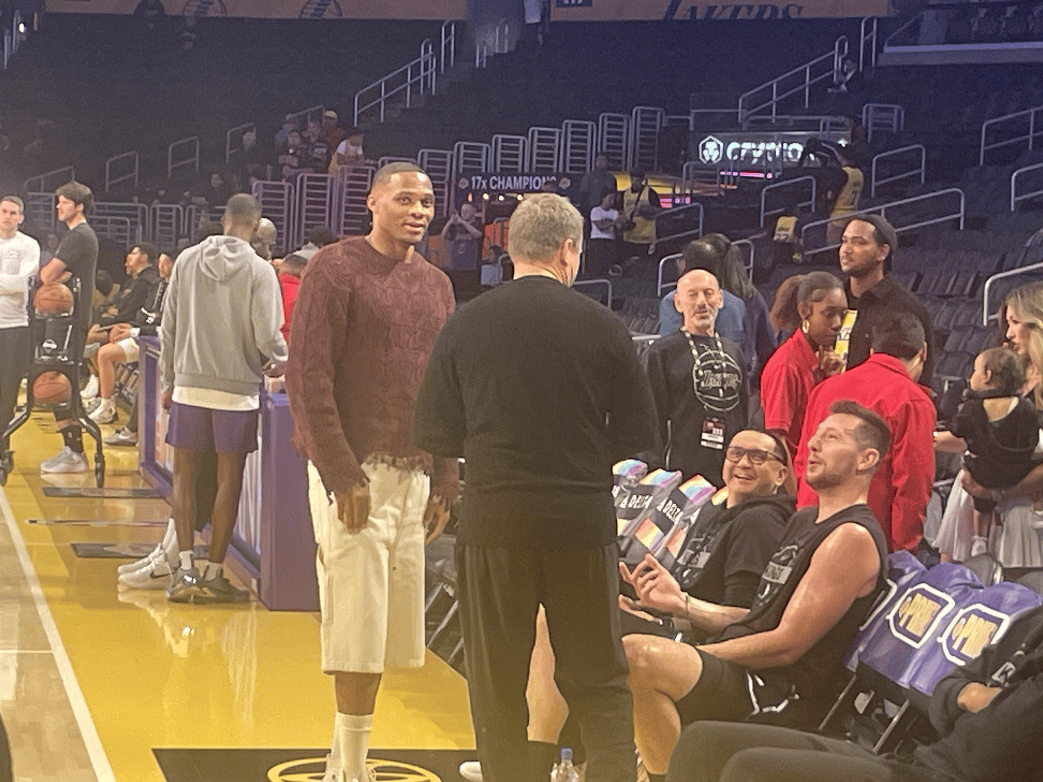 美記MarkG Medina更新社媒分享賽前照,人并國王新援威斯布魯克與湖人助教斯科特-布魯克斯在場邊親切交流。助教