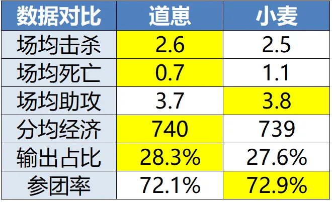 小麥這邊,年總的KDA在淘汰賽發(fā)育路里位居第二,場均助攻3.8僅次于一諾,72.9%的參團(tuán)率發(fā)育路第一同樣是數(shù)據(jù)不俗。不過比起道崽,小麥在本屆年總的穩(wěn)定性并沒有那么高。