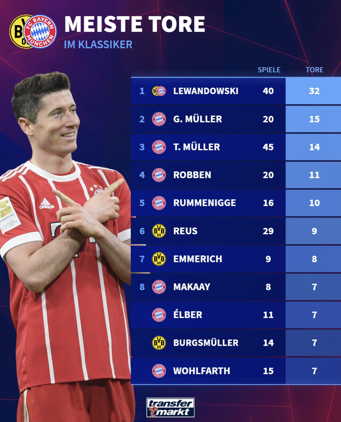 曾效力過(guò)拜仁和多特的球高萊萬(wàn)以40場(chǎng)32球的紀(jì)錄高居榜首,排在二三位的居榜居位是拜仁球員蓋德-穆勒的15球和托馬斯-穆勒的14球。