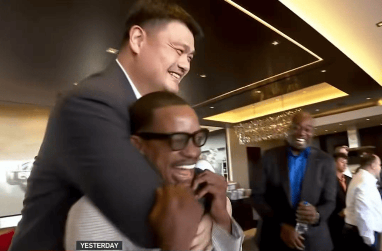 比賽中轉(zhuǎn)播方給出鏡頭,姚明姚明與其前隊(duì)友史蒂夫-弗朗西斯在火箭主場(chǎng)重聚。弗朗