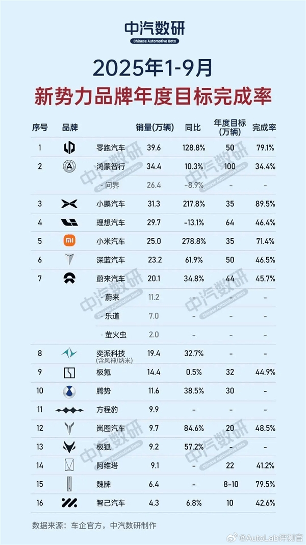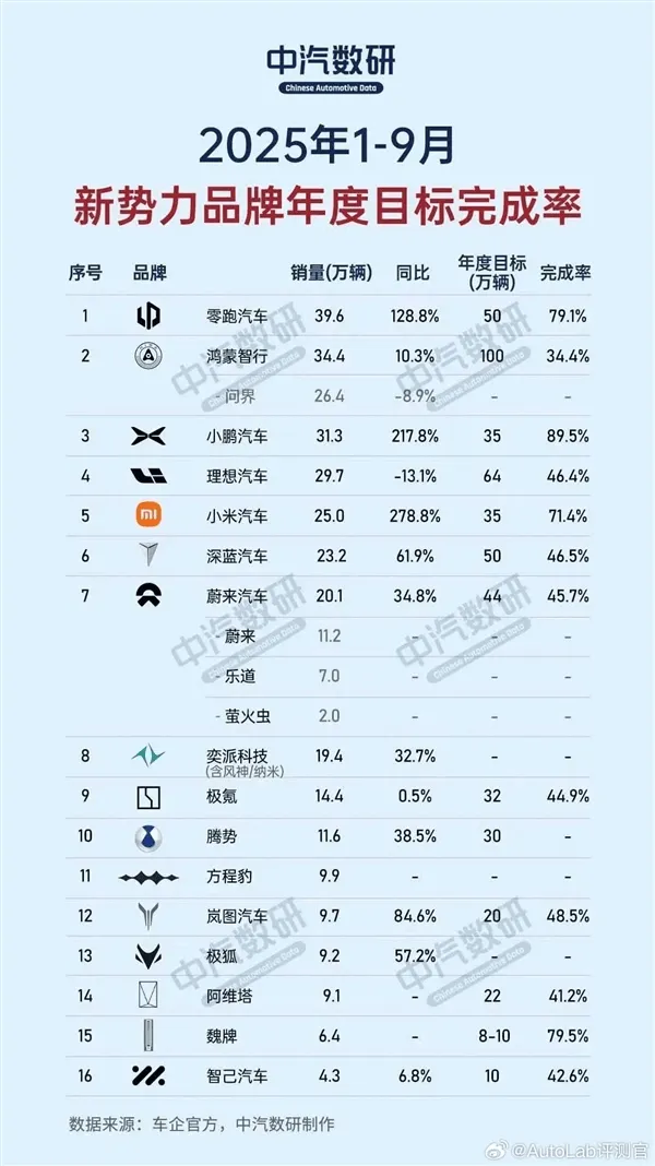 虎撲10月06日訊 中汽數(shù)研日前發(fā)布了新勢力品牌1-9月年度目標(biāo)完成率情況。