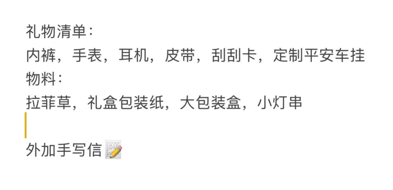 首先一個禮盒里面鋪了些黑金色拉菲草,禮物盒上面我用包裝紙包起來的盲盒,小米手環(huán)10pro,小米耳機,費格100支7A內褲,我們倆合照的平安車掛(帶去九華山開一下光),刮刮樂(包含給他按摩肩頸10次套餐,他喜歡按肩,我克緹的美容師不用擔心按不好),真皮皮帶一條,所有禮物用盲盒我自己包起來給他送去店里,提個小蛋糕(不用太大,主要是儀器,因為我倆都不愛吃甜食),外加自己手寫信一封,大家覺得這樣可以嗎?感覺男人也需要儀式感吧,東西已備好。
