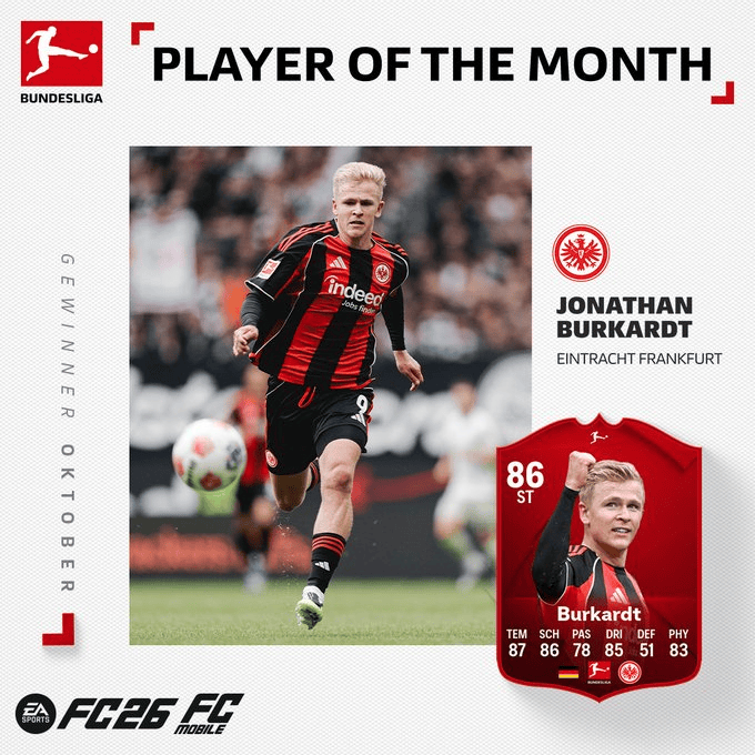 虎撲11月06日訊 德甲官方宣布,法蘭克福前鋒伯卡特當選德甲10月最佳球員。