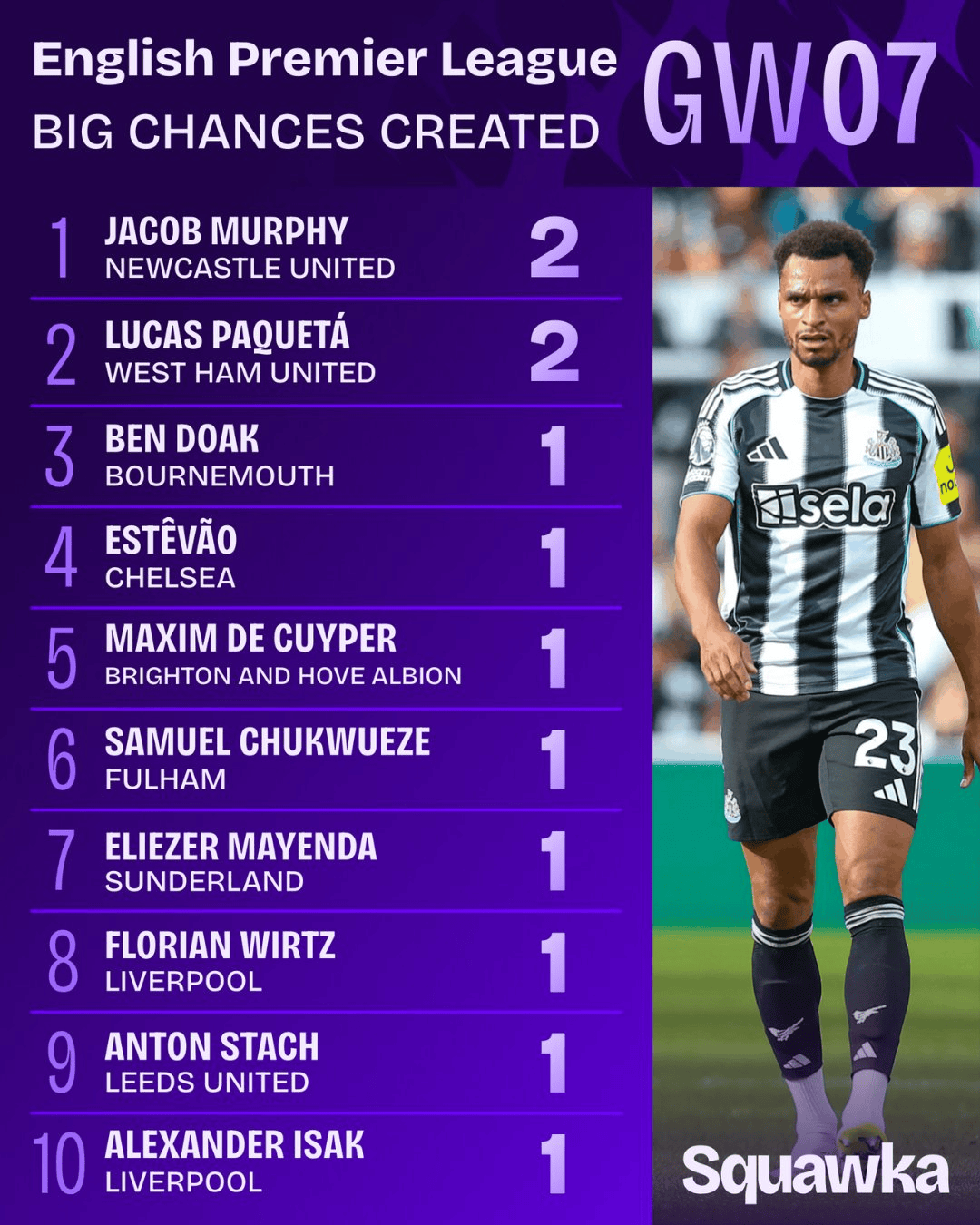 虎撲10月07日訊 數(shù)據(jù)網(wǎng)站squawka統(tǒng)計了本輪英超的數(shù)據(jù)。其中在創(chuàng)造良機榜上,流言輪英墨菲、帕奎塔并列榜首。