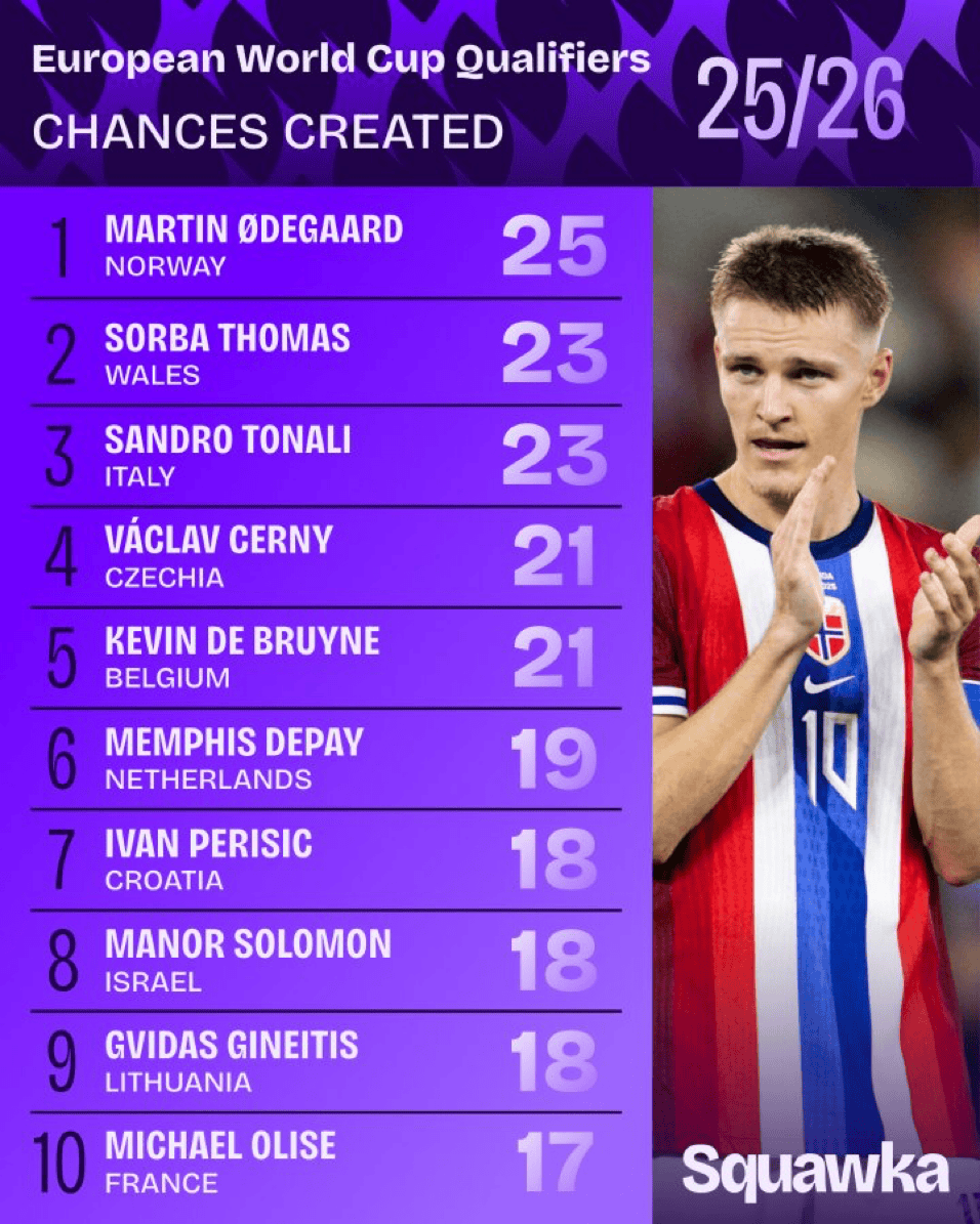 虎撲10月15日訊 Squawka統(tǒng)計(jì)了本屆世界杯歐洲區(qū)預(yù)選賽創(chuàng)造機(jī)會(huì)最多的球員,詳情如下: