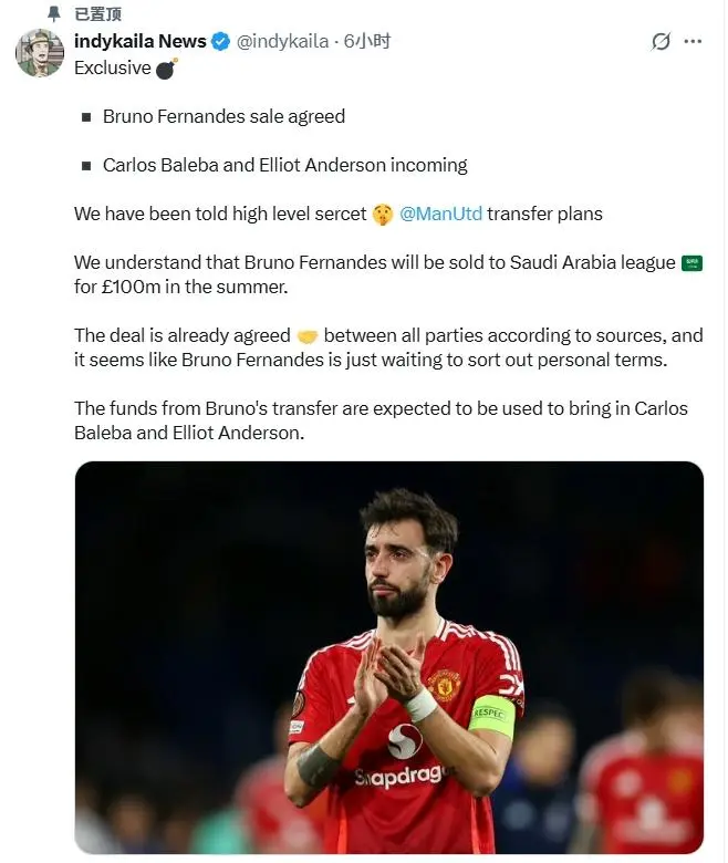 綠帽哥indykaila News獨(dú)家消息,曼聯(lián)將以1億鎊價(jià)格將B費(fèi)賣(mài)給沙特聯(lián)球隊(duì)。特聯(lián)