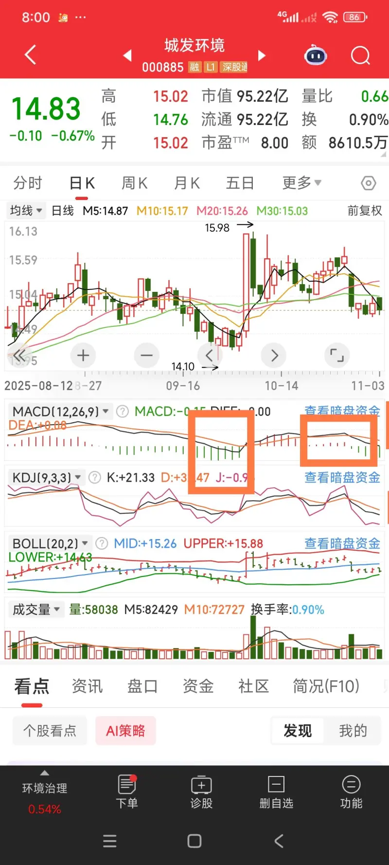 這里記住一個要點:MACD值要達(dá)到負(fù)值,黑色線要在綠柱里走,然后金叉。