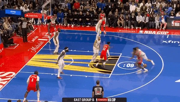 比賽的奇庫(kù)球德第二節(jié),埃奇庫(kù)姆分球,姆分命中德拉蒙德底角三分出手命中。拉蒙