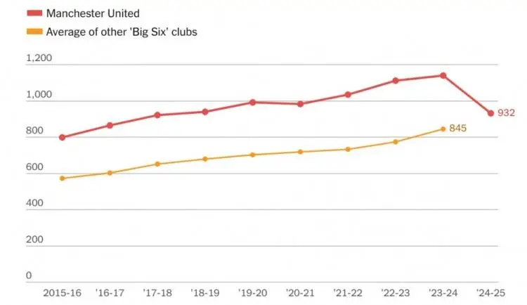 拉特克利夫削減成本的舉措在員工數(shù)量上體現(xiàn)得最為明顯。2024年2月以來的公告表明,曼聯(lián)總計(jì)可能有多達(dá)450名全職員工離職,而2024-25賽季的員工總數(shù)已較上年同期減少208人。鑒于這是平均值且裁員計(jì)劃在整個(gè)賽季持續(xù)進(jìn)行,預(yù)計(jì)2025-26賽季將進(jìn)一步下降。