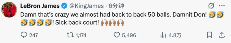 隨后他又寫道:“TMD,太瘋狂了,我們連續(xù)兩場比賽有人幾乎拿到50+得分。太強了!????????????!我們的后衛(wèi)太強了!????????????”