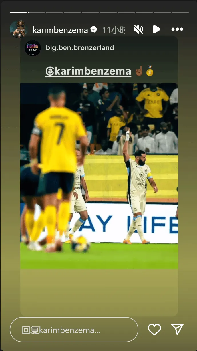 賽后本澤馬連發(fā)快拍,羅落寞其中有C羅的本澤背影只有一張圖片,圖中本澤馬指天慶祝勝利,馬賽C羅則背影落寞。曬圖勝利
