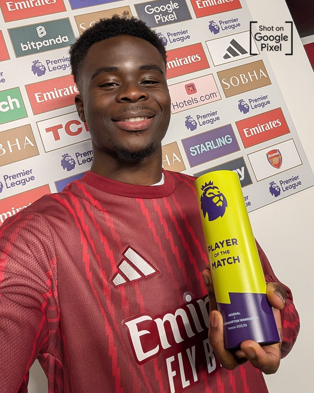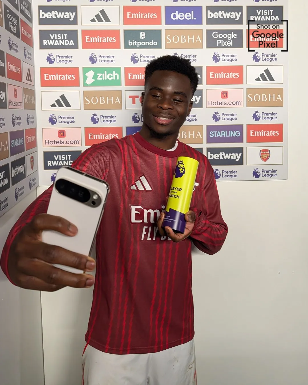 賽后阿森納官方社媒曬出薩卡與本場英超官方最佳球員獎杯的合照合照。