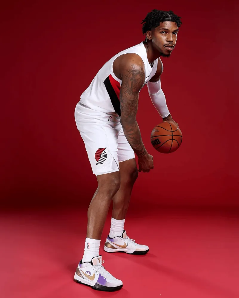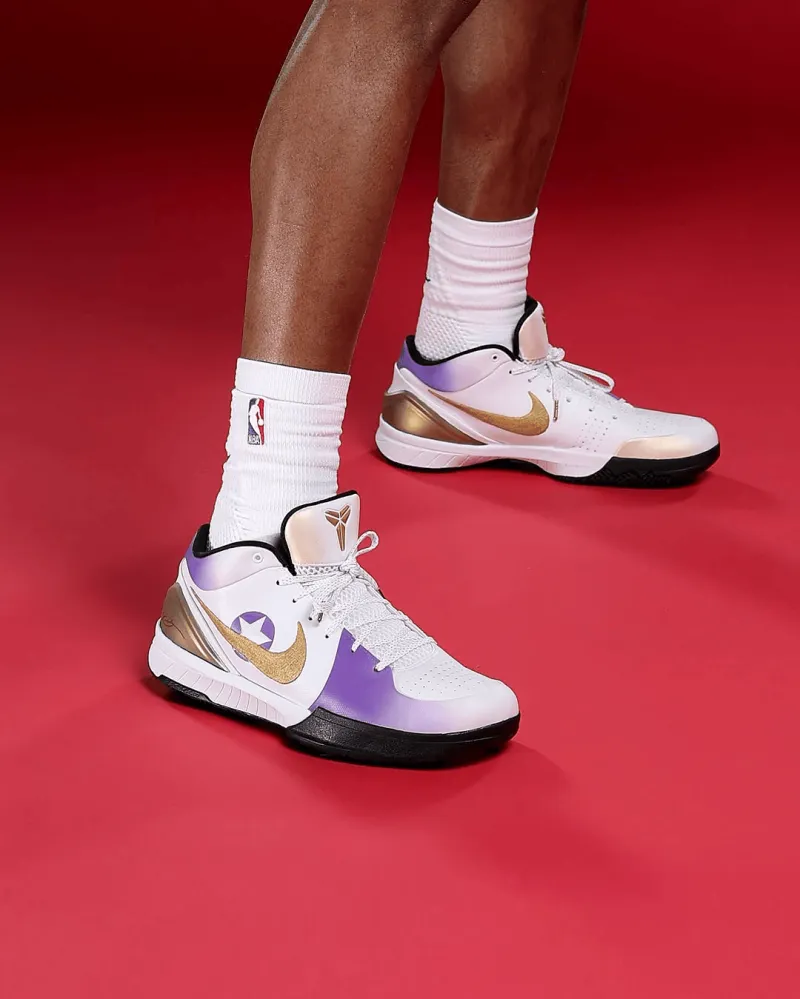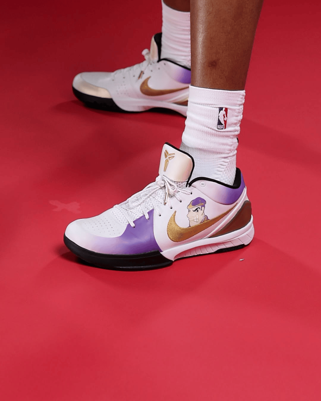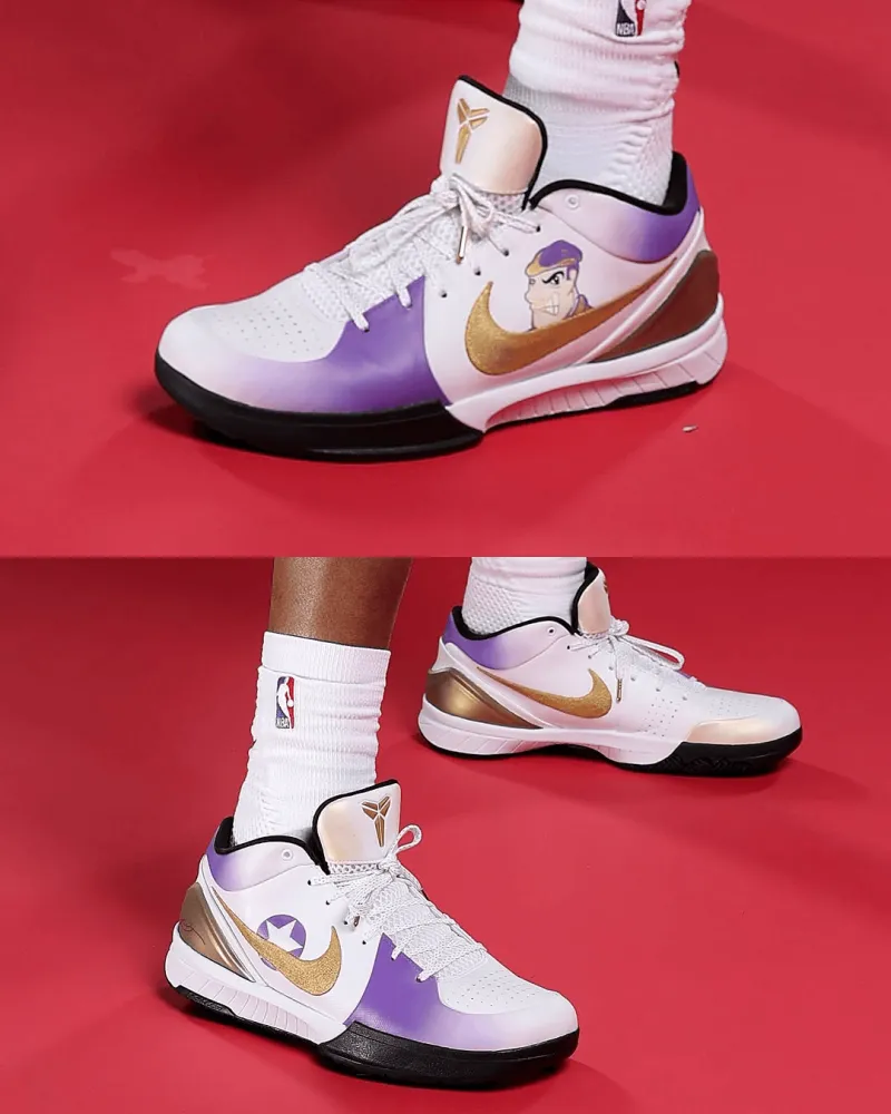 定妝照拍攝過程中,流言路凱勒布新秀凱勒布-樂福上腳客制版高中配色Nike Kobe 4 Protro,板銘鞋面圖案來自樂福高中母校籃球隊(duì)—基督教兄弟預(yù)科高中(Christian Brothers College High School Cadets)。流言路凱勒布