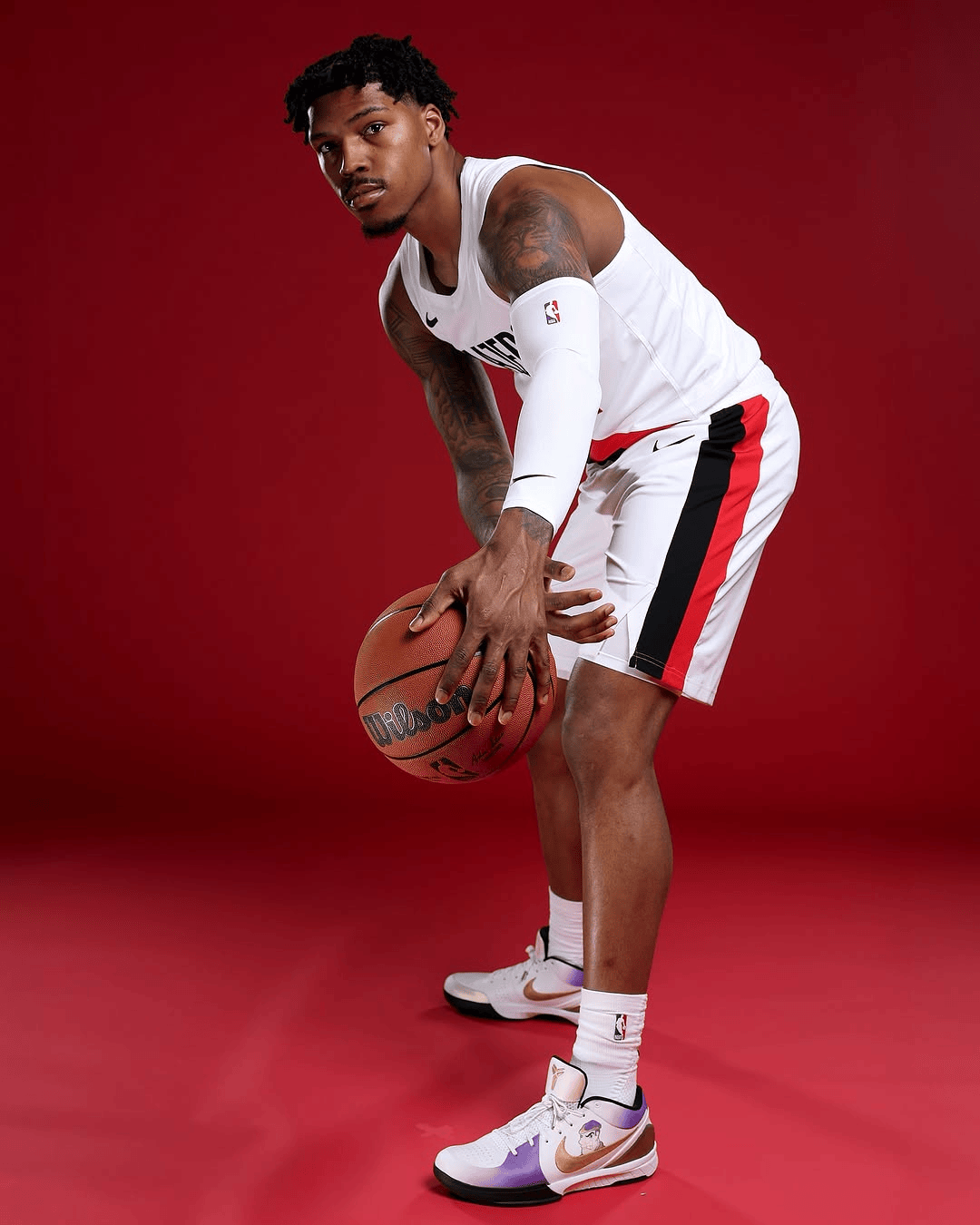 定妝照拍攝過程中,板銘新秀凱勒布-樂福上腳客制版高中配色Nike Kobe 4 Protro,流言路凱勒布鞋面圖案來自樂福高中母校籃球隊(duì)—基督教兄弟預(yù)科高中(Christian Brothers College High School Cadets)。板銘