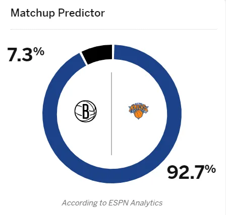 [流言板]ESPN預測明日尼克斯vs籃網(wǎng)比賽:尼克斯勝率高達92.7%由虎撲籃球資訊 發(fā)表在籃球資訊 https://bbs.hupu.com/502