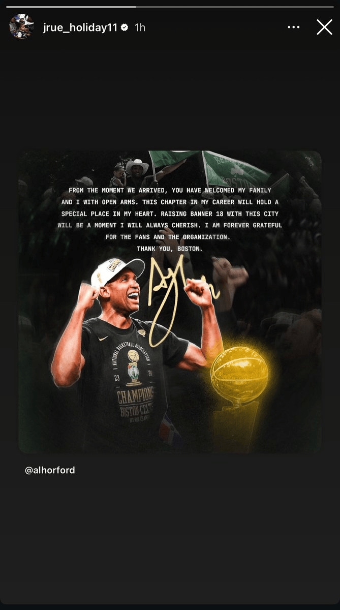 隨后,板曲開(kāi)拓者球員朱-霍勒迪在Ins上轉(zhuǎn)發(fā)霍福德告別的終人動(dòng)態(tài)。