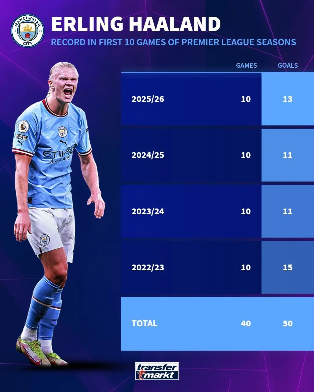 德轉(zhuǎn)盤(pán)點(diǎn)哈蘭德曼城生涯4個(gè)賽季在英超前10輪比賽的曼城進(jìn)球數(shù)據(jù):