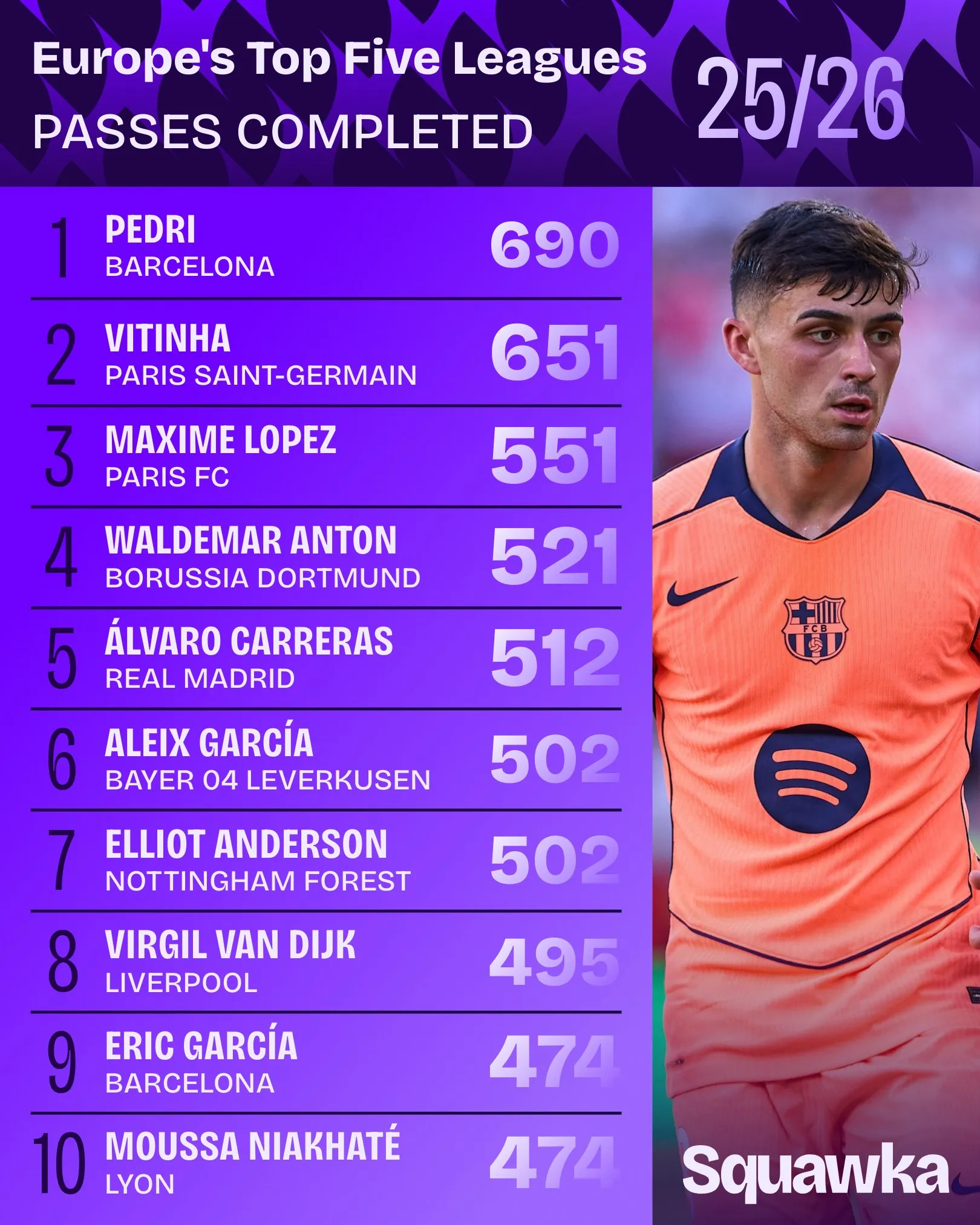 來源:X虎撲10月16日訊 Squawka數(shù)據(jù)統(tǒng)計本賽季至今五大聯(lián)賽傳球榜,佩德里690次居首,大聯(lián)多維蒂尼亞排名第二。球次球