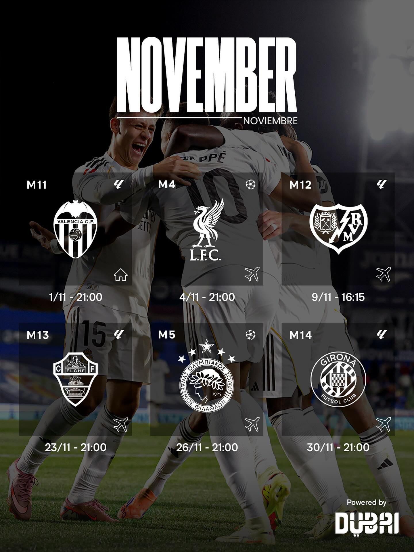 虎撲10月29日訊 皇家馬德里官方發(fā)布了11月份的賽程,具體如下(北京時(shí)間):