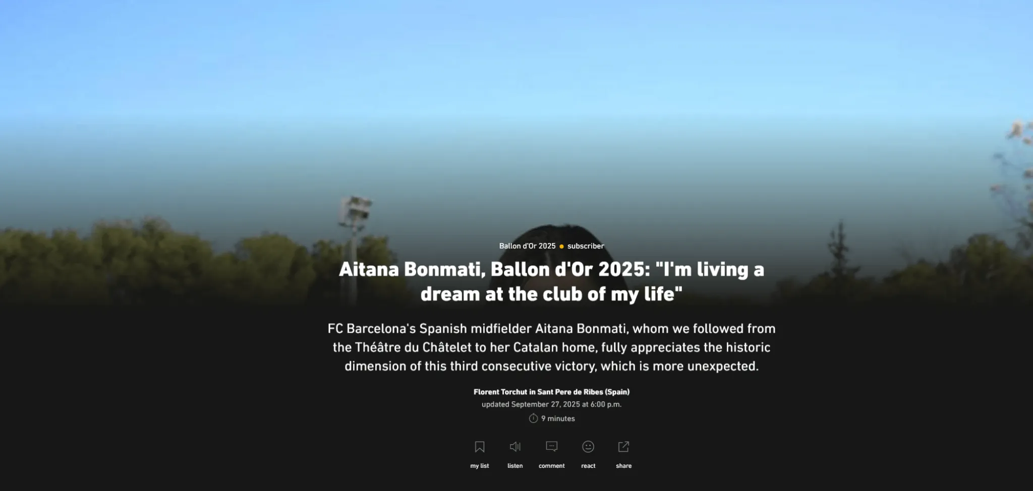 沒有。(她笑了。)我并沒有真正意識(shí)到發(fā)生在我身上的一切…如果有人在我7歲開始踢球的時(shí)候告訴我,我們將在2025年與我的三座金球獎(jiǎng)杯一起接受采訪…我絕對(duì)不敢想象。