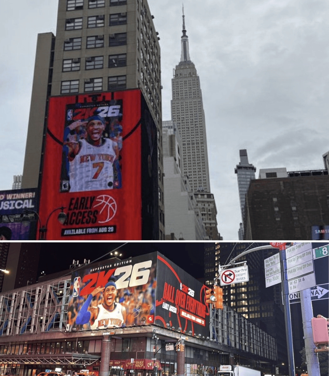 虎撲08月19日訊 今日,紐約媒體New York Basketball更新動(dòng)態(tài),現(xiàn)紐曬出了紐約市中心的中心卡梅羅-安東尼2K26封面海報(bào)。