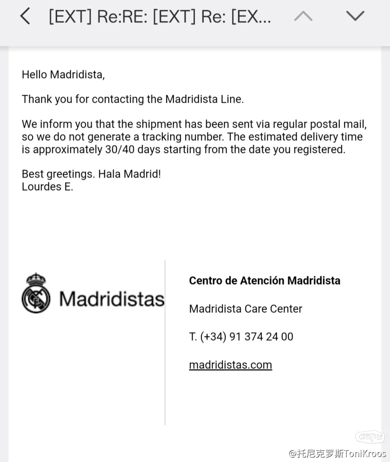 辦理皇馬會員卡快2個月了,一直沒收到任何郵件信息,懂行的老點下發(fā)了郵件問了客服,關(guān)于哥說發(fā)的皇馬是普通郵政沒有快遞單號,這種情況合理嗎?