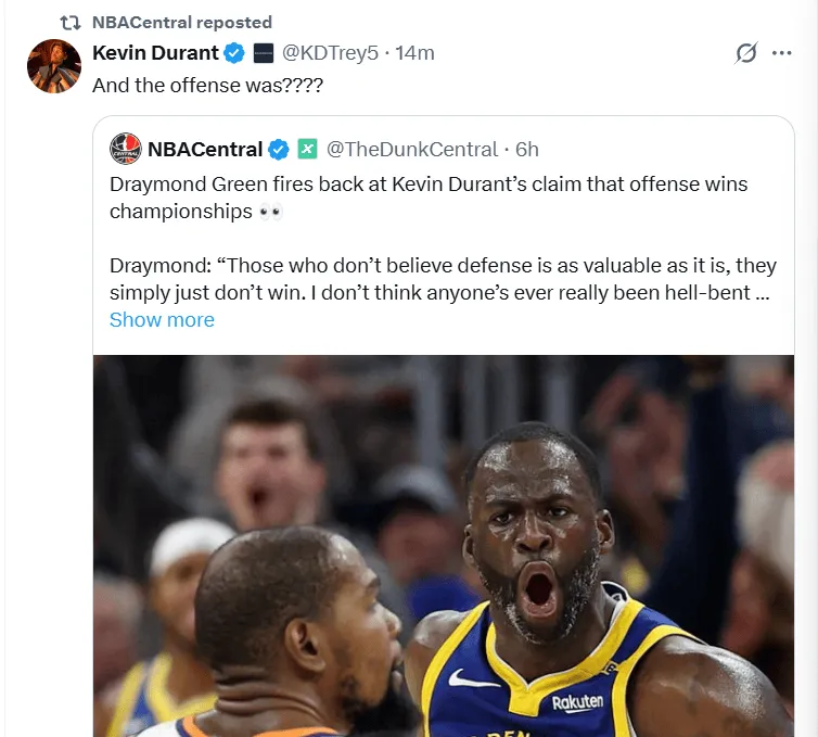 杜蘭特轉(zhuǎn)發(fā)了這篇報(bào)道,格林并且配文道:And the offense was?勇士???(勇士時(shí)期)進(jìn)攻水平是什么呢?