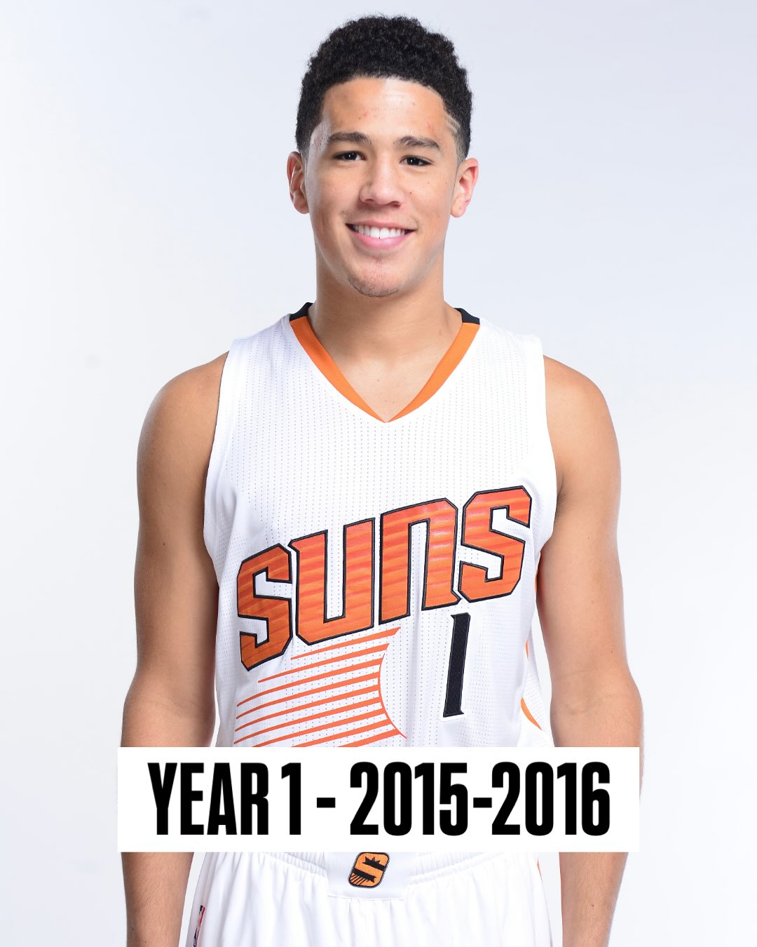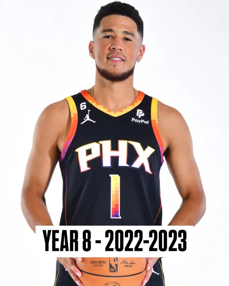虎撲09月27日訊 NBA官方更新Ins,曬出一組太陽球員德文-布克歷年來的官方定妝照與球迷分享。