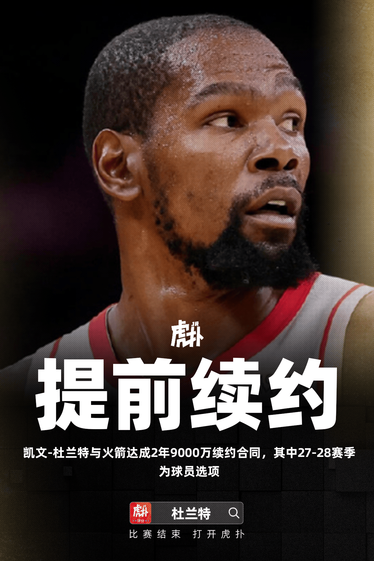 虎撲10月19日訊 根據(jù)Shams的報(bào)道,凱文-杜蘭特與火箭達(dá)成2年9000萬續(xù)約合同,薪杜續(xù)約其中27-28賽季為球員選項(xiàng)。年萬