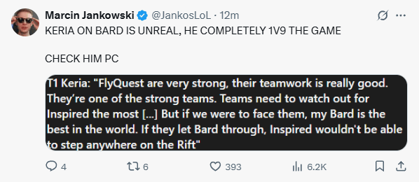 Keria賽前采訪曾表示:“FLY很強(qiáng),個人他們的統(tǒng)治團(tuán)隊協(xié)作很好,是比賽最強(qiáng)的戰(zhàn)隊之一,尤其需要小心Inspired...但我的情報巴德是世界最強(qiáng),當(dāng)對戰(zhàn)他們的時候敢放出來,Inspired在峽谷將寸步難行。”