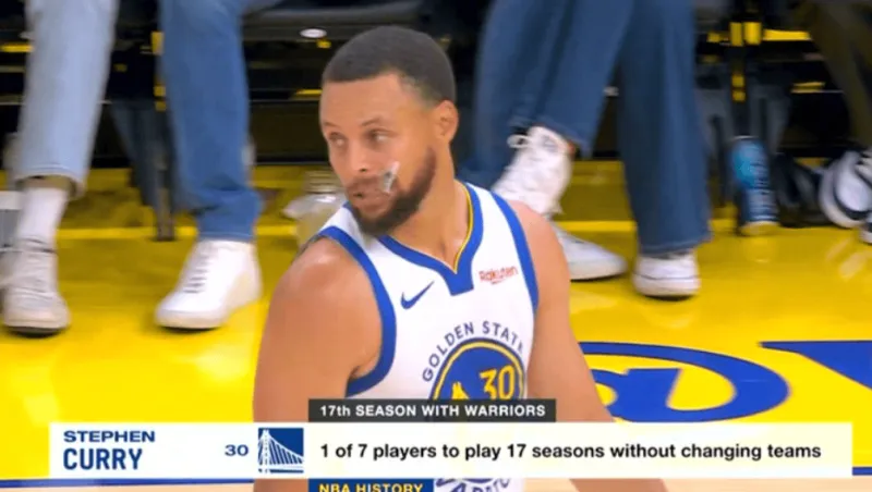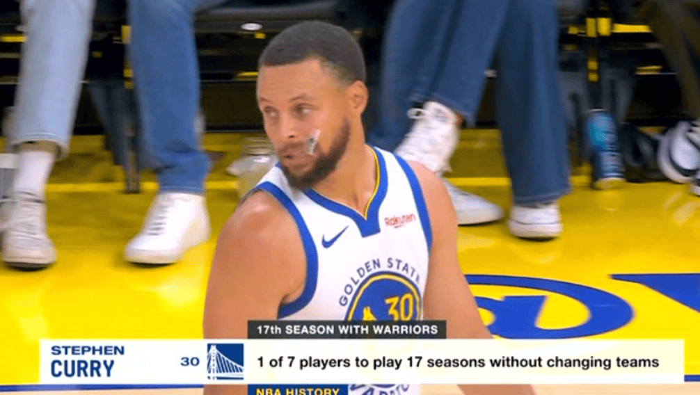 比賽開始后,場(chǎng)轉(zhuǎn)現(xiàn)場(chǎng)轉(zhuǎn)播方打出字幕,庫(kù)里勇士后衛(wèi)斯蒂芬-庫(kù)里是位同NBA歷史上7位在同一支球隊(duì)效力17+賽季的球員之一。