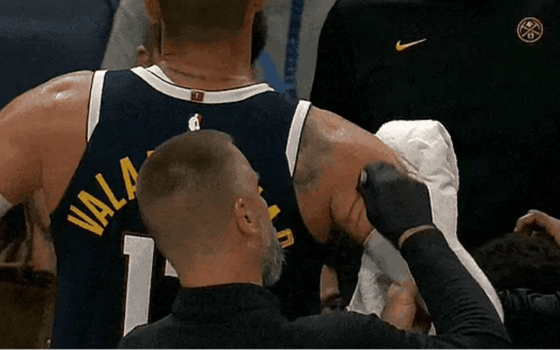 全場比賽,全場掘金球員瓦蘭丘納斯投籃5中2,中分中得助攻三分2中1得到5分5籃板2助攻2蓋帽,到分在第三節(jié)被抓出了2道血痕。