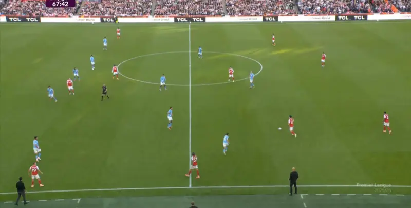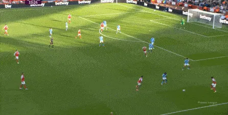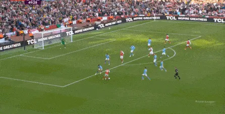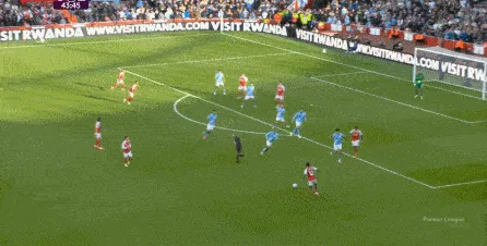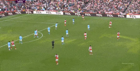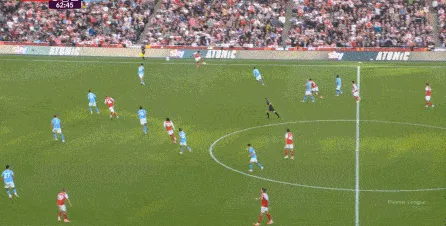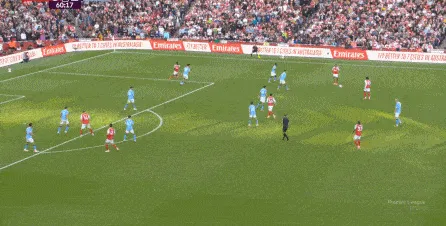 于是在傷停補時第1分鐘,曼城一次不必要地全隊壓上,給自己埋下了大坑,賴因德斯、薩維尼奧和尼科的前插,不應該帶動全隊一起移動,因為全隊上來也沒有進行逼搶,反而讓阿森納有了充足的時間,用傳球和跑位聯(lián)動打擊曼城的五后衛(wèi)防線: