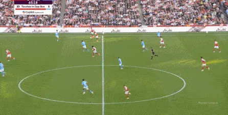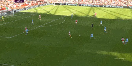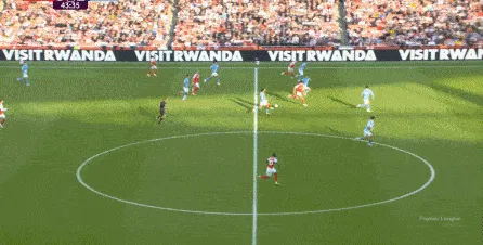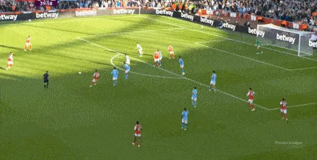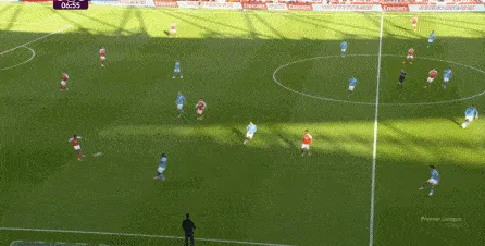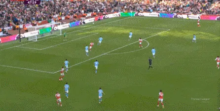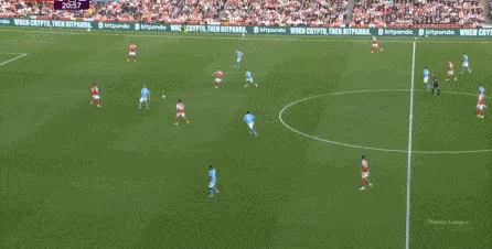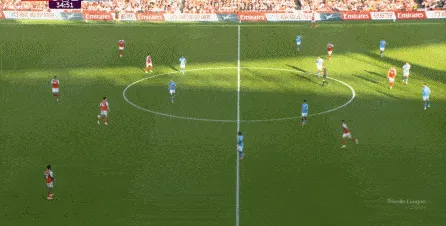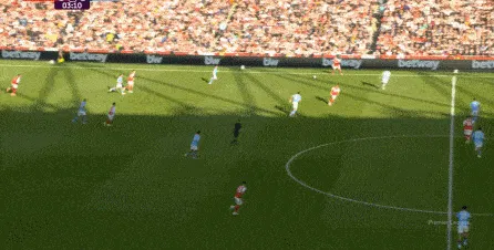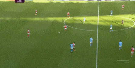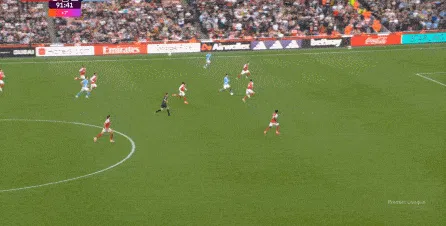 然而在第9分鐘,阿森納在左路的推進和傳中沒有送出威脅,反而在中場區(qū)域形成了爭球局面,薩利巴可能落得太靠后了,但前頂?shù)街袌鰠^(qū)域的加布里埃爾也沒有形成效果,就此讓曼城打出了一次輕松寫意的反擊: