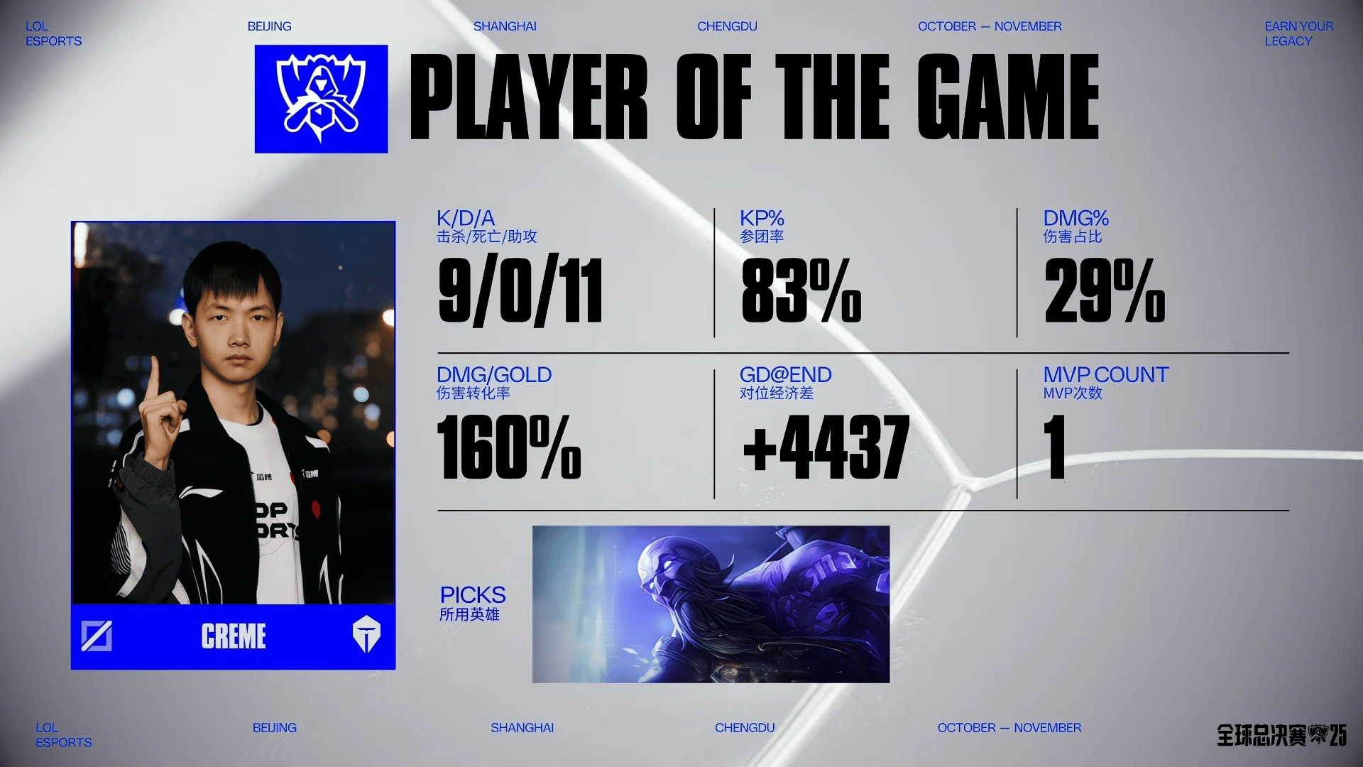 來源:虎撲電競虎撲10月16日訊 在剛剛結束的S15瑞士輪的比賽中,Creme瑞茲砍下9/0/11的瑞茲戰(zhàn)績,拿下TES對陣100T全場MVP