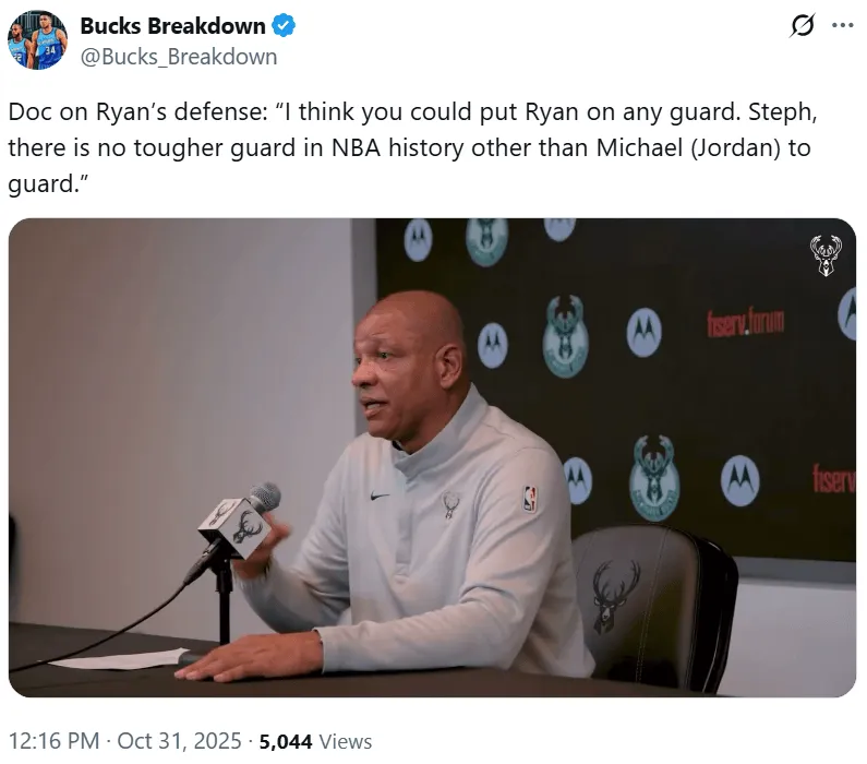 賽后,雄鹿主帥道格-里弗斯接受了記者的采訪,當被問及萊恩-羅林斯的防守時,他表示: