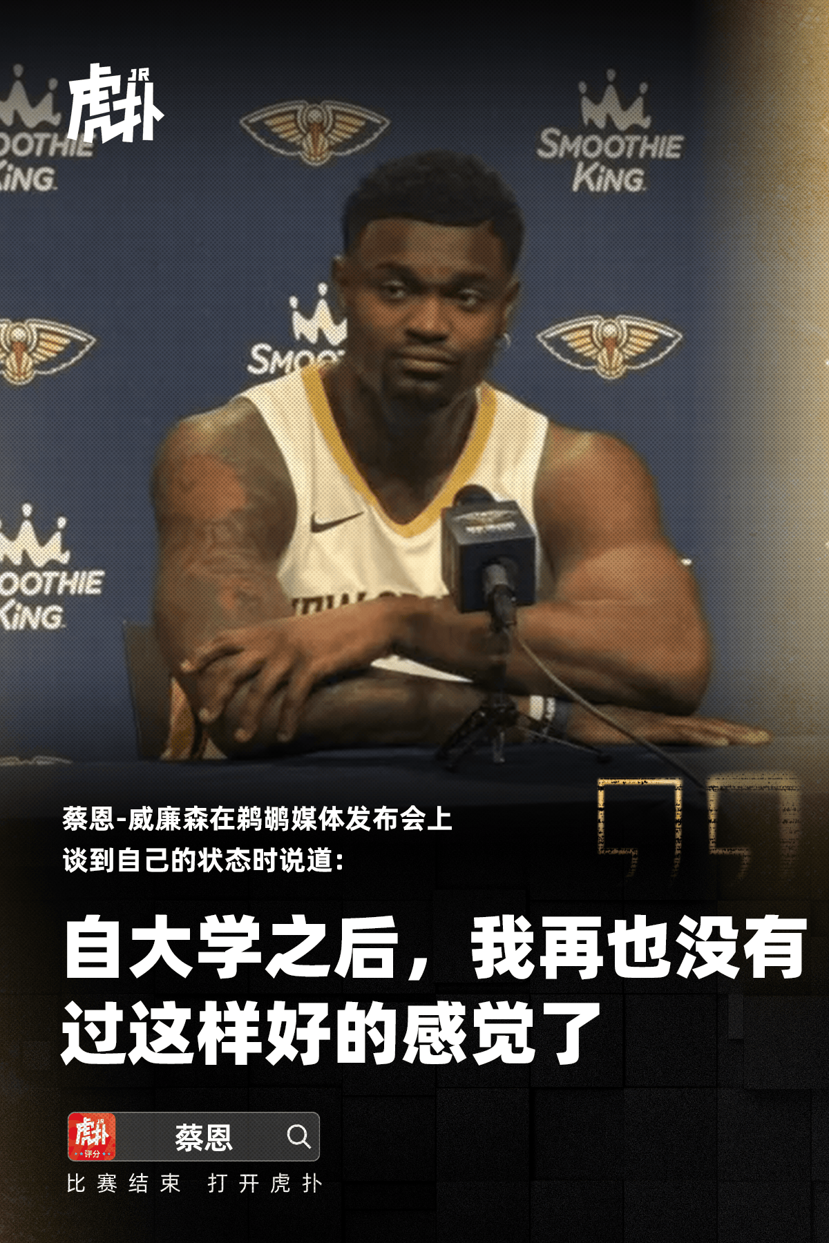 虎撲09月24日訊 今日,鵜鶘召開媒體發(fā)布會,狀態(tài)自蔡恩-威廉森接受了記者采訪。后再在談到自己的也沒有過樣好狀態(tài)時,蔡恩: