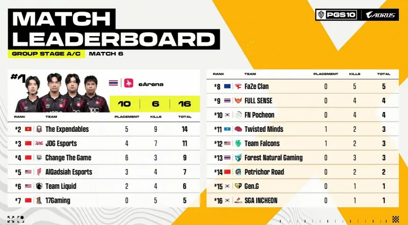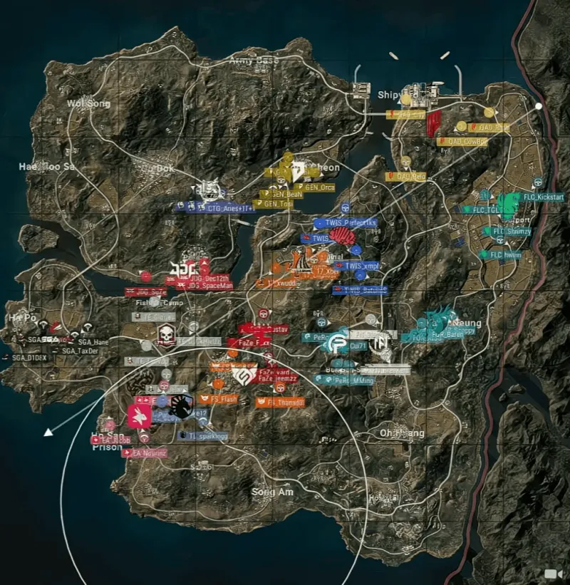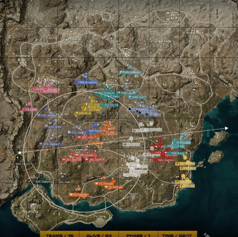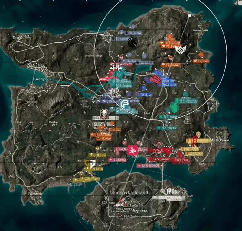 階段6剩余5隊,CTG獨(dú)狼進(jìn)圈被FOR發(fā)現(xiàn)淘汰,17和FN基本互換,TE接管戰(zhàn)場,決賽圈FOR和TE對決。TE率先被打掉一人。