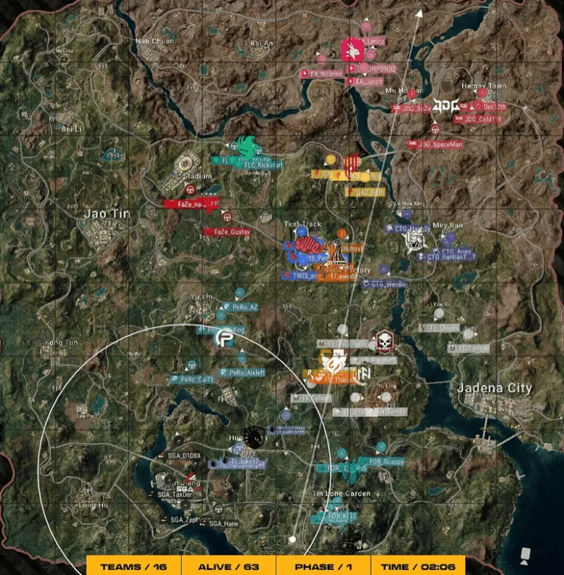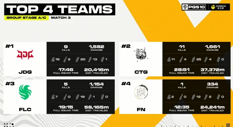 階段8,CTG前點(diǎn)一人被JDG打掉,CTG后點(diǎn)放倒JDG一人,隨后1換1,CTG全線進(jìn)攻JDG,但前點(diǎn)兩人仍是2換1,而后點(diǎn)掛后的人則被FN獨(dú)狼打掉,決賽圈FN獨(dú)狼想利用道具淘汰JDG無果,JDG扶人后2打1完成吃雞。