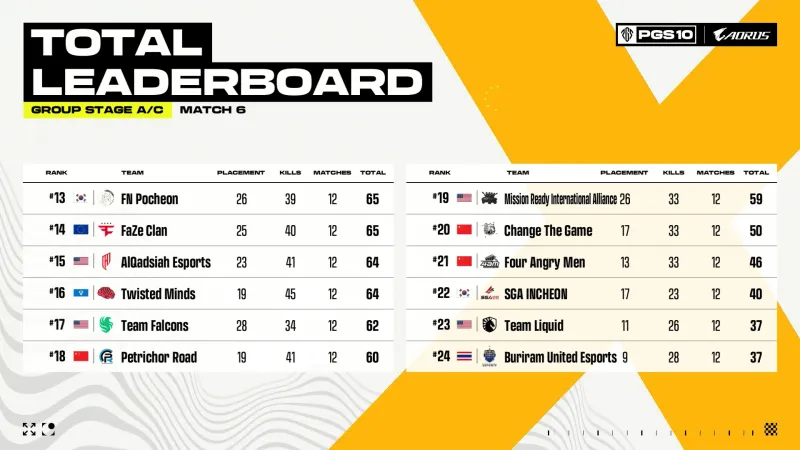 階段6剩余8隊,組賽TWIS進(jìn)圈路上率先被淘汰,領(lǐng)跑FLC炸掉SGA,壓線但FLC隨后被FaZe打掉兩人,晉級局隨后EA被FLC打掉,賽后收官但FLC也被打掉。組賽