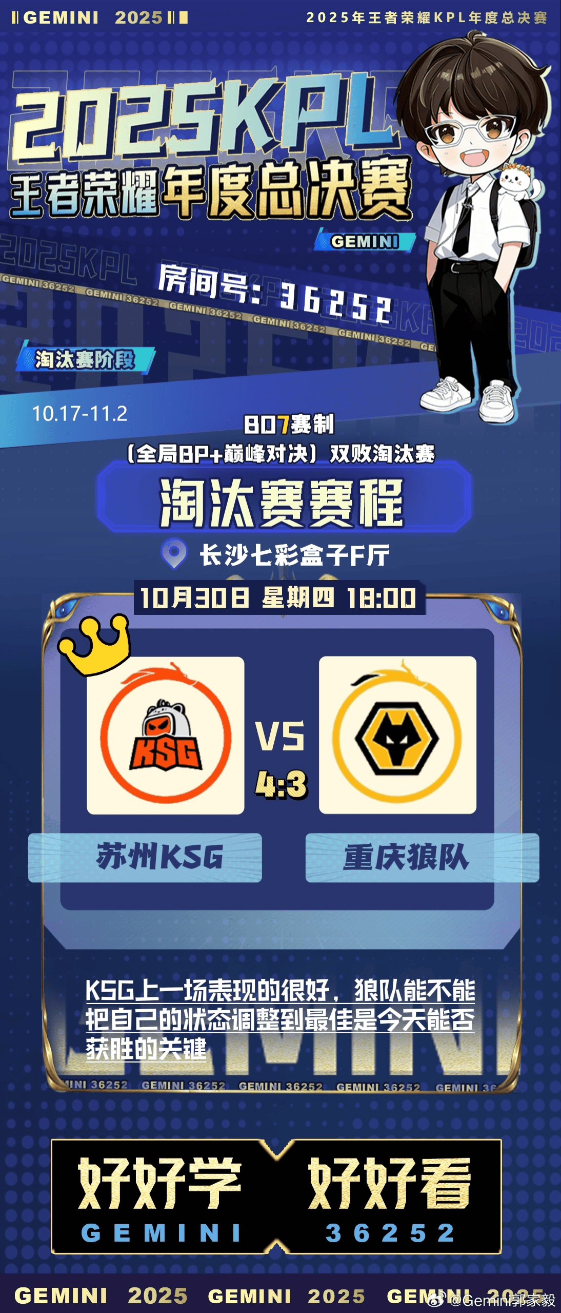 虎撲10月30日訊 Gemini預(yù)測(cè)今日賽事:KSG巔峰對(duì)決淘汰狼隊(duì),今天不可能零封,日賽原文如下: