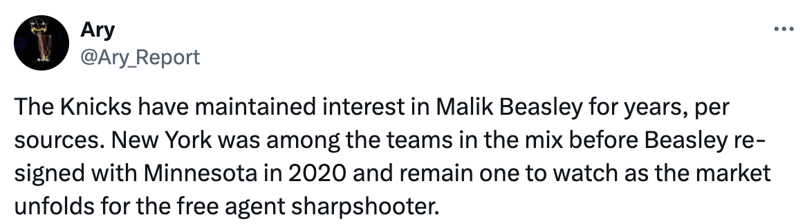 Ary表示,在比斯利2020年與森林狼續(xù)約之前,尼克斯就曾是有意簽下這位后衛(wèi)的球隊(duì)之一。隨著現(xiàn)在比斯利在自由球員市場(chǎng)的行情變化,尼克斯現(xiàn)在仍然是簽下比斯利的值得關(guān)注的球隊(duì)之一。