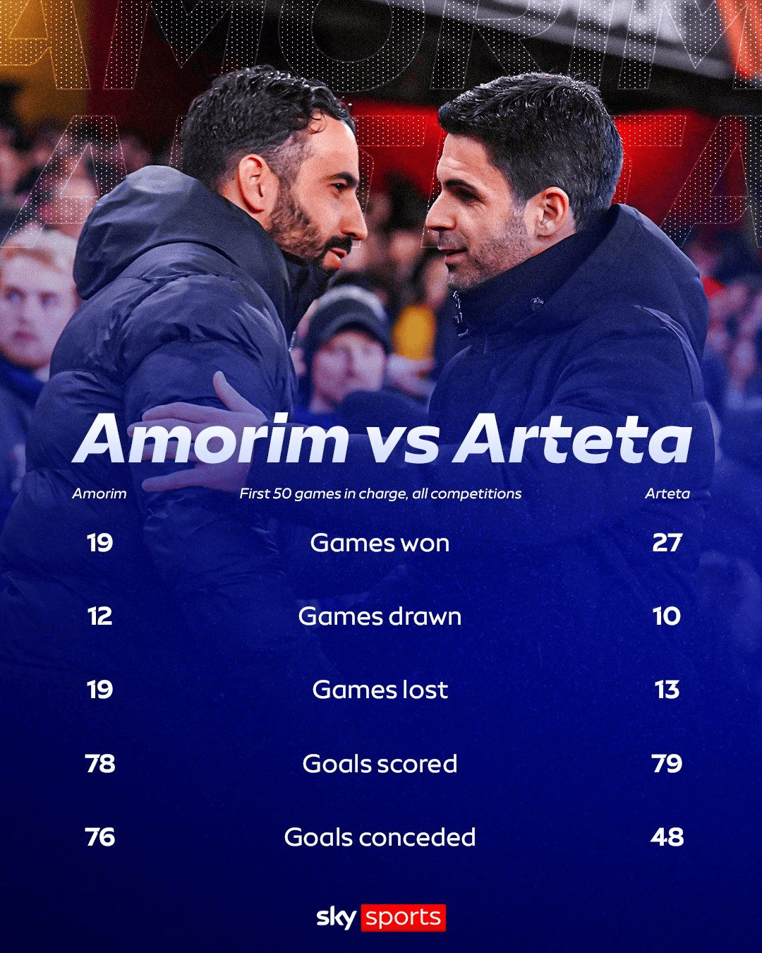 虎撲10月10日訊 阿莫林執(zhí)教曼聯(lián)場次來到50場,天空體育也統(tǒng)計了他執(zhí)教曼聯(lián)前50場與阿爾特塔執(zhí)教阿森納前50場各項賽事的特塔特塔戰(zhàn)績對比。