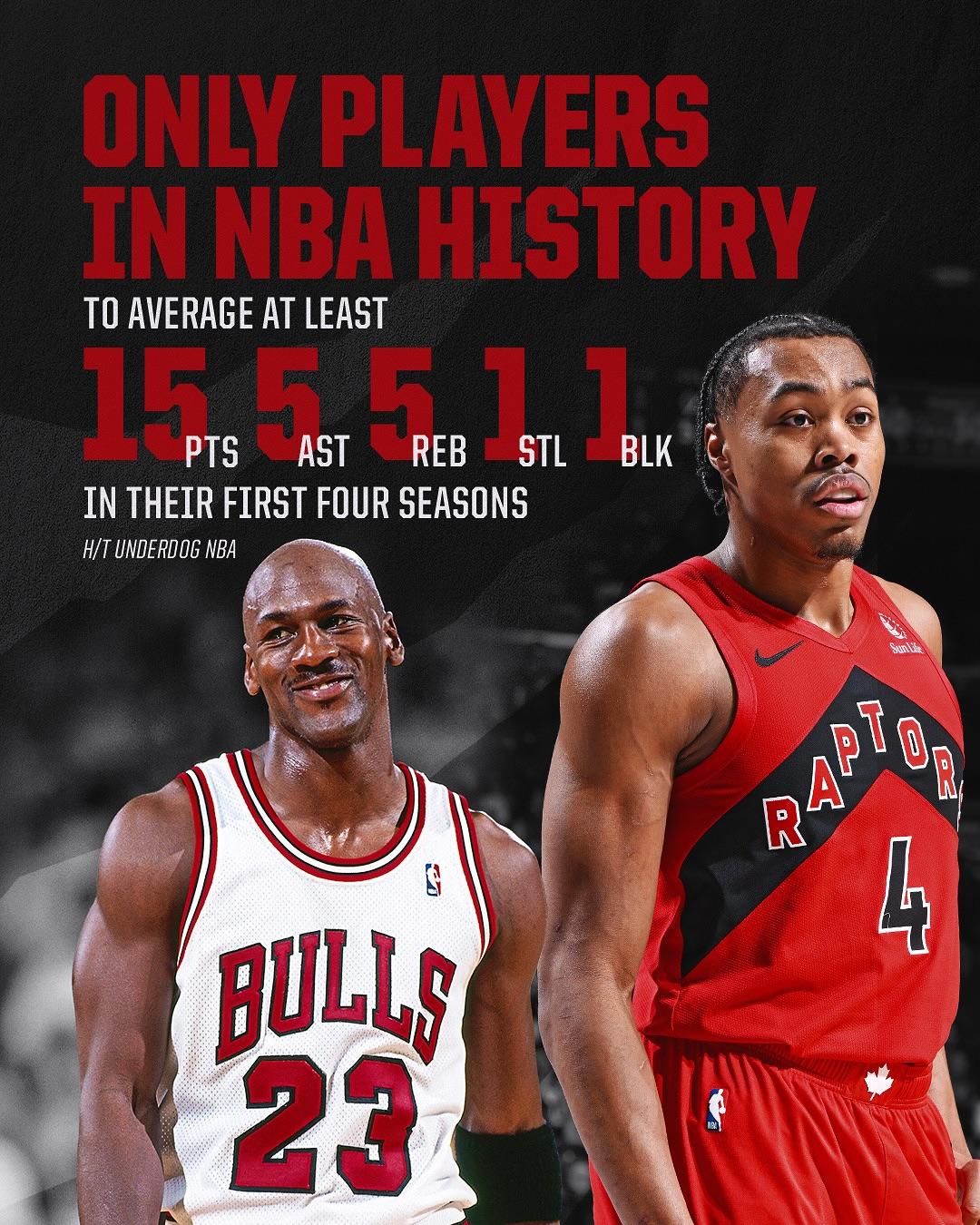 猛龍球員斯科蒂-巴恩斯是場均NBA歷史上第二位在生涯前四個(gè)賽季場均可以得到15分5籃板5助攻1搶斷1蓋帽的球員。