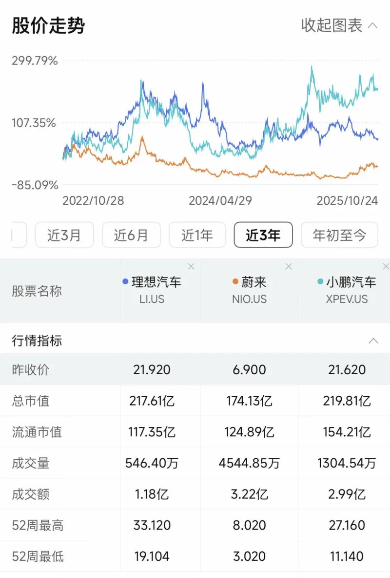 從近3年的年上股價(jià)走勢(shì)上也能看出,近一年小鵬上升最為明顯,升趨勢(shì)顯遠(yuǎn)超蔚來(lái)和理想。鵬汽