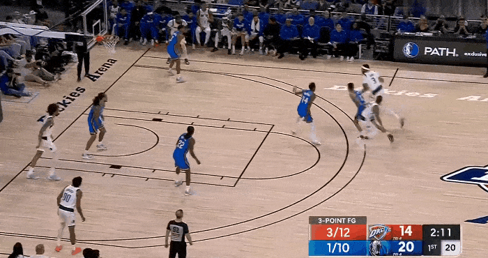 第一節(jié)比賽中,接戴進(jìn)獨拉塞爾弧頂接戴維斯回傳三分投進(jìn),分投分打獨行俠領(lǐng)先9分打停雷霆。行俠