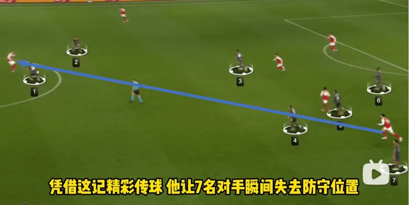 那么有誰(shuí)站出來(lái)彌補(bǔ)了這個(gè)缺口了呢?答案是賴斯。他的傳球推進(jìn)數(shù)據(jù)本賽季有了大幅提升。不僅遠(yuǎn)高于打B2B的上賽季,比以拖后為主的23/24賽季也有明顯進(jìn)步。不僅有招牌的長(zhǎng)傳找右邊鋒的線路,還能傳出像下面這樣精彩的穿透球。這樣的表現(xiàn)也讓他經(jīng)常出現(xiàn)在本賽季英超第一中場(chǎng)的討論中。