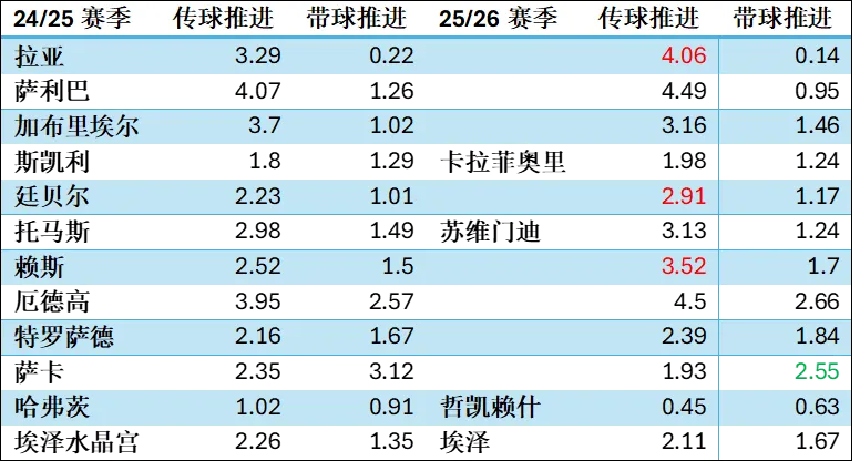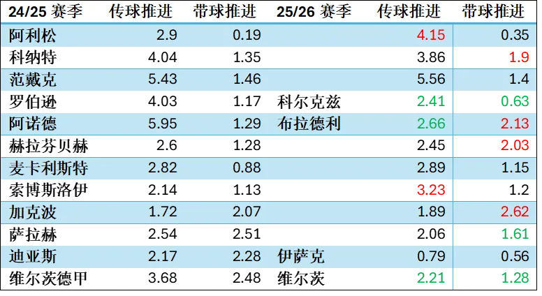 以下是兩隊(duì)的每90分鐘推進(jìn)數(shù)據(jù),名單稍微簡(jiǎn)化了一點(diǎn),每個(gè)位置選一個(gè)主要球員,再加上了埃澤和維爾茨兩個(gè)多位置球員的前后對(duì)比。