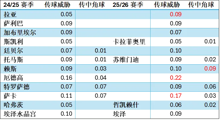 其實(shí)大部分預(yù)期威脅的變化和推進(jìn)數(shù)據(jù)比較吻合,前文都提過(guò),不贅述了。值得一提的是薩卡的傳球威脅和賴斯的傳中/角球威脅。主要是賴斯的角球質(zhì)量高不說(shuō),罰的還多。他目前罰了28個(gè)角球,曼城全隊(duì)才29個(gè)。